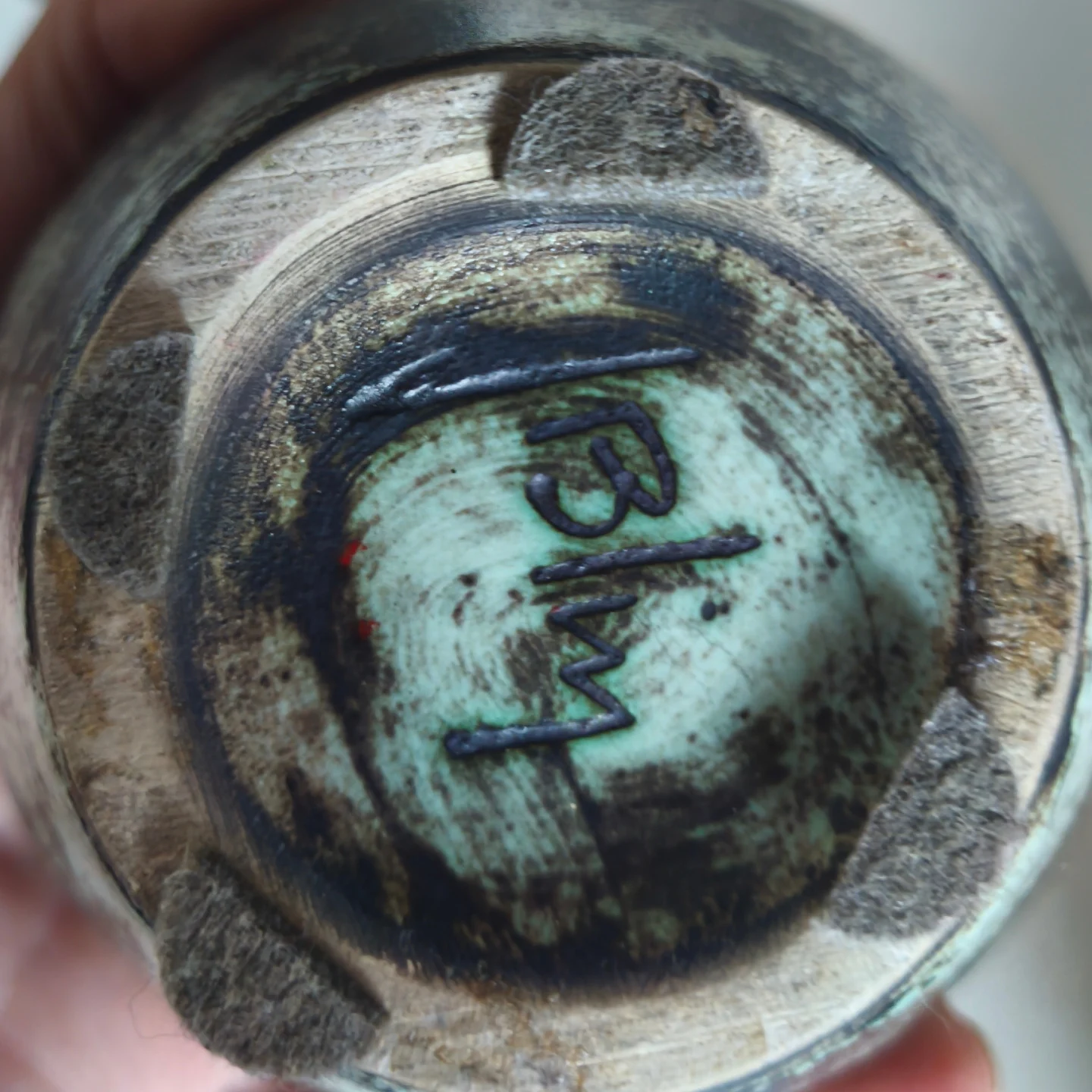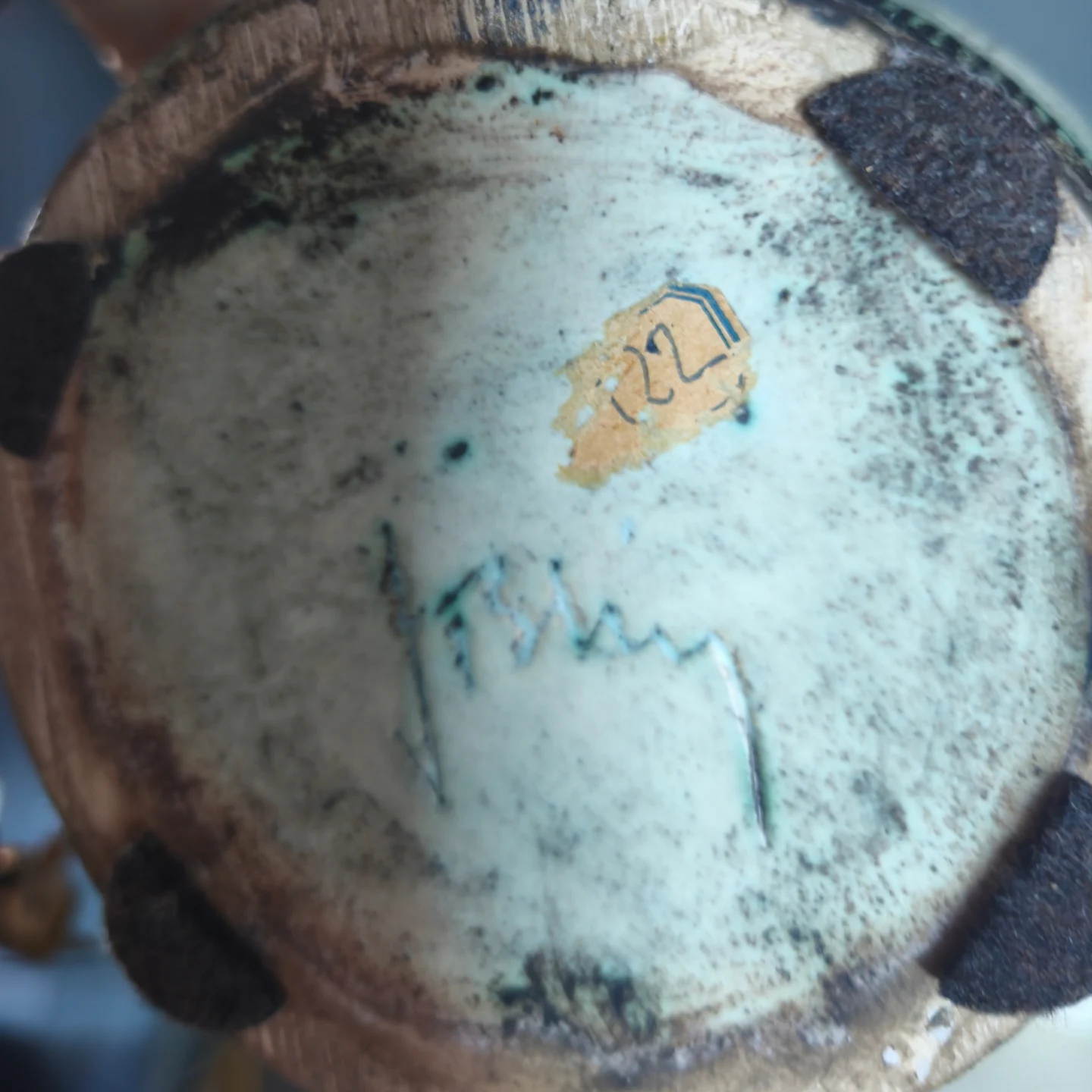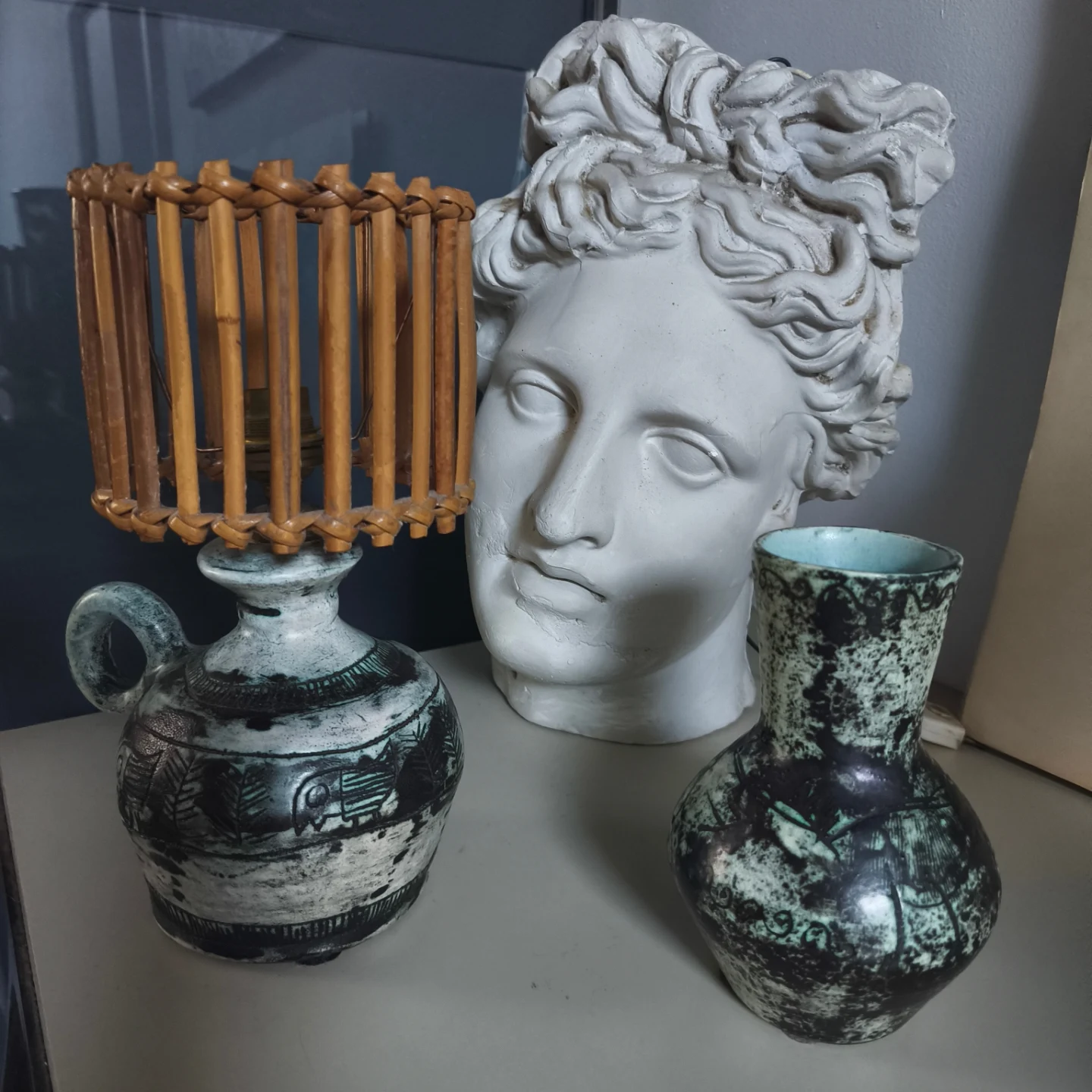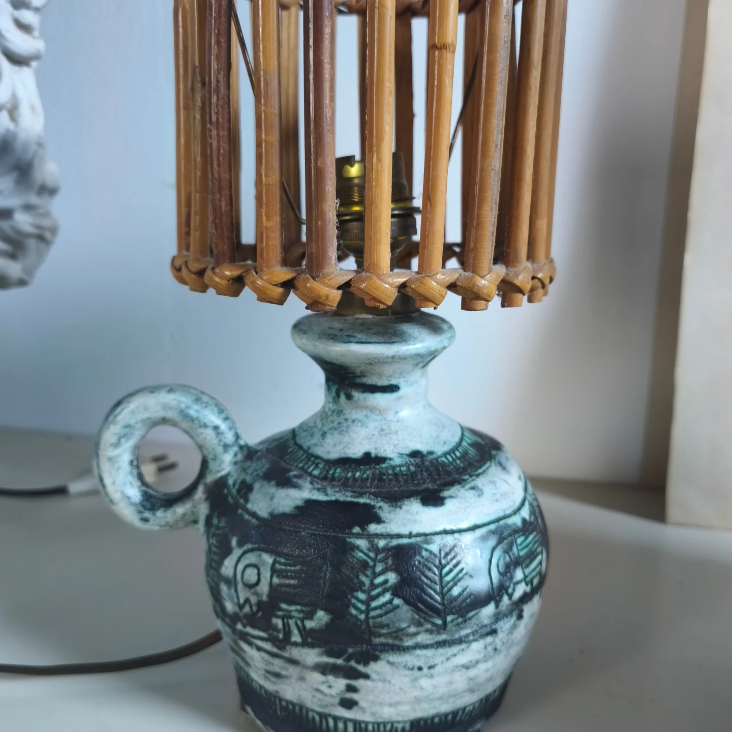 Charmante petite lampe en céramique signée Jacques Blin, figure majeure de la céramique française des années 50. Son décor gravé typique, représentant des oiseaux stylisés et des motifs végétaux, est sublimé par un émaillage nuancé aux tonalités vertes et noires. La base en forme de petit vase à anse témoigne du langage artistique unique de l’artiste. Elle est accompagnée de son abat-jour d’origine en rotin, qui apporte chaleur et authenticité à l’ensemble. Une pièce pleine de poésie, emblématique du renouveau de la céramique française du XXe siècle.