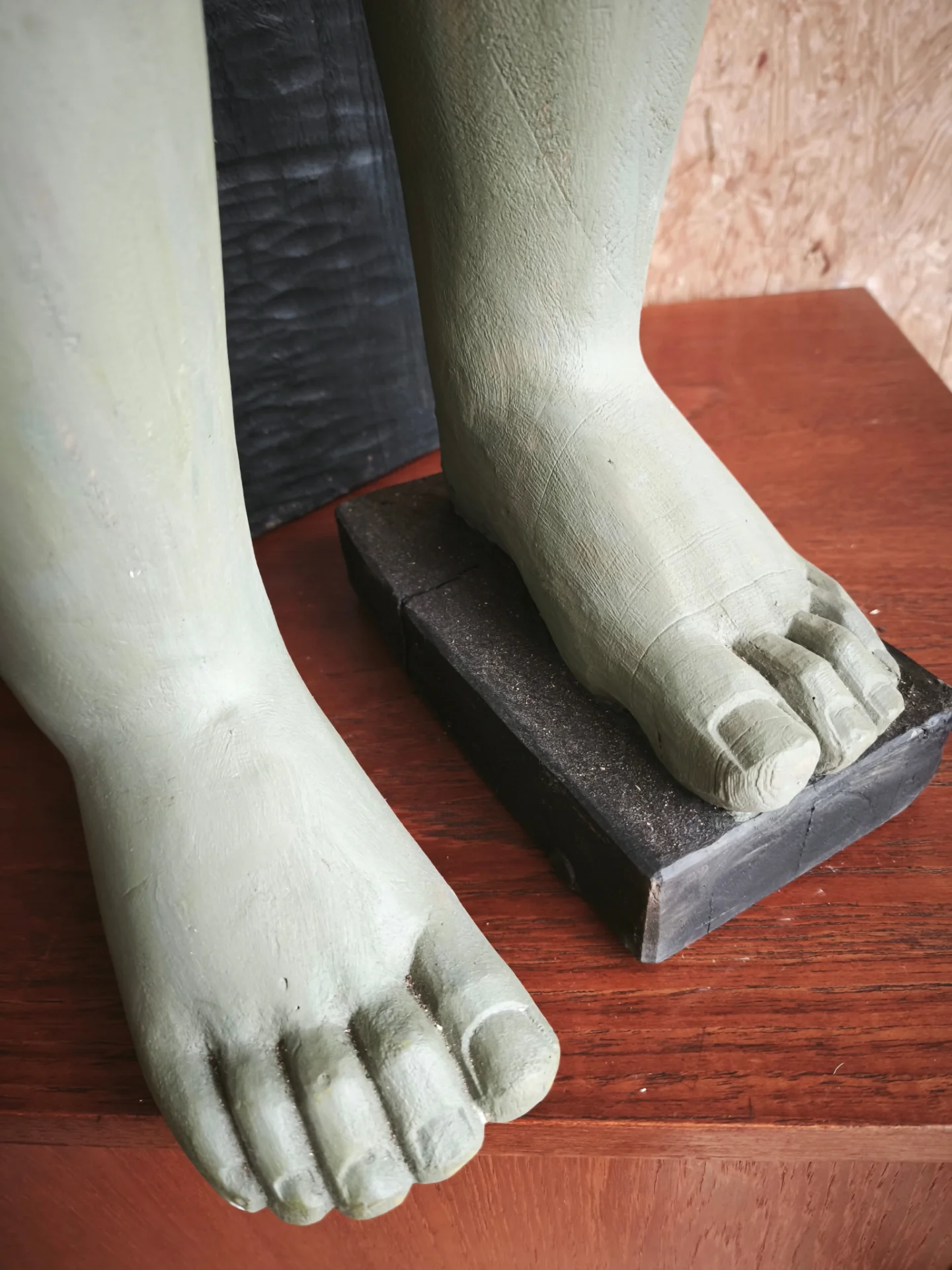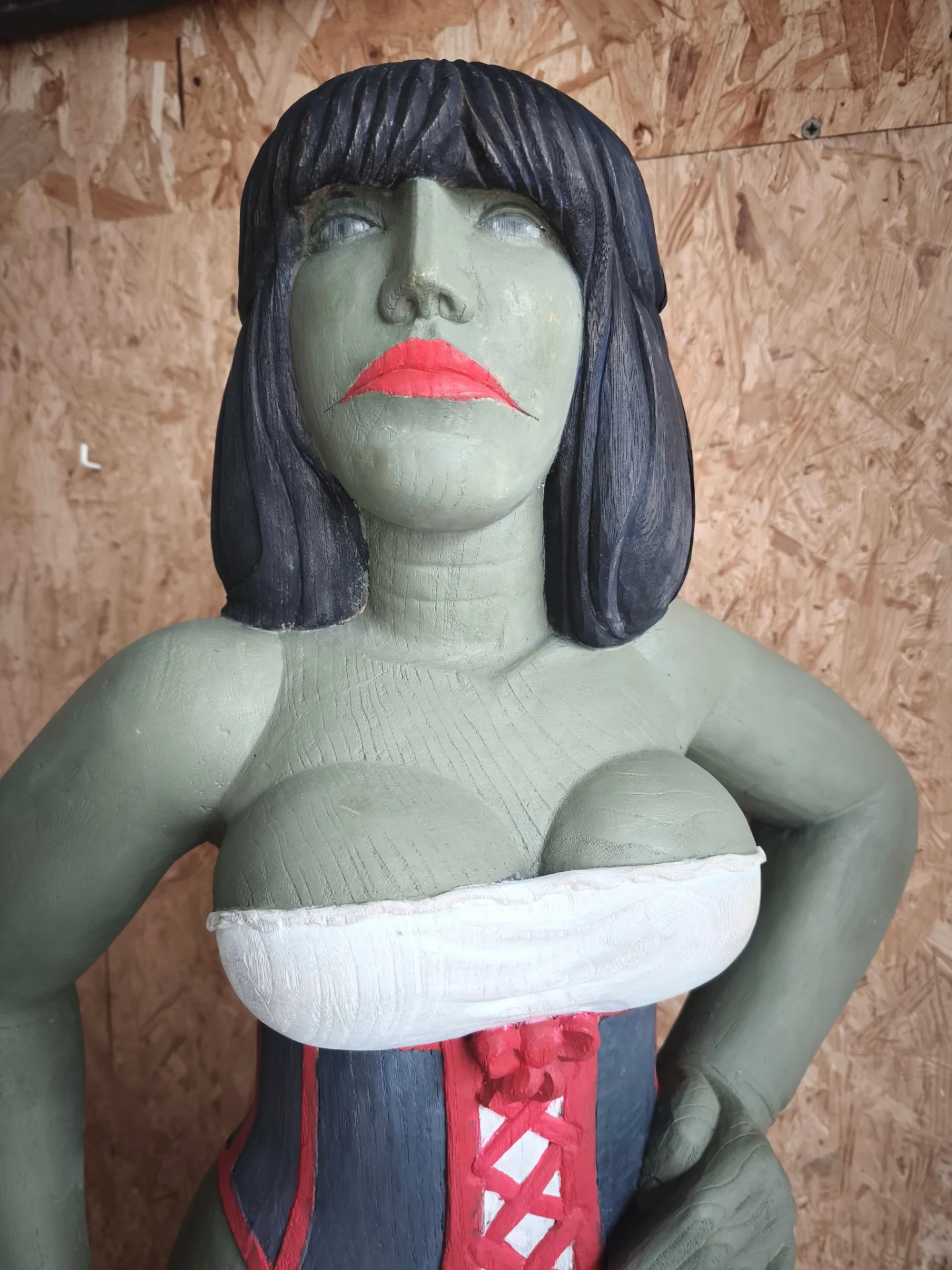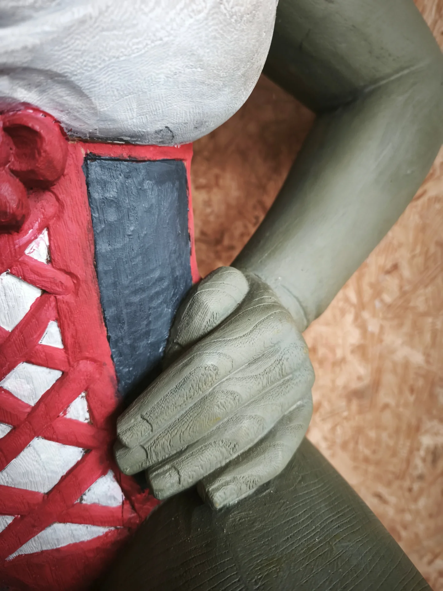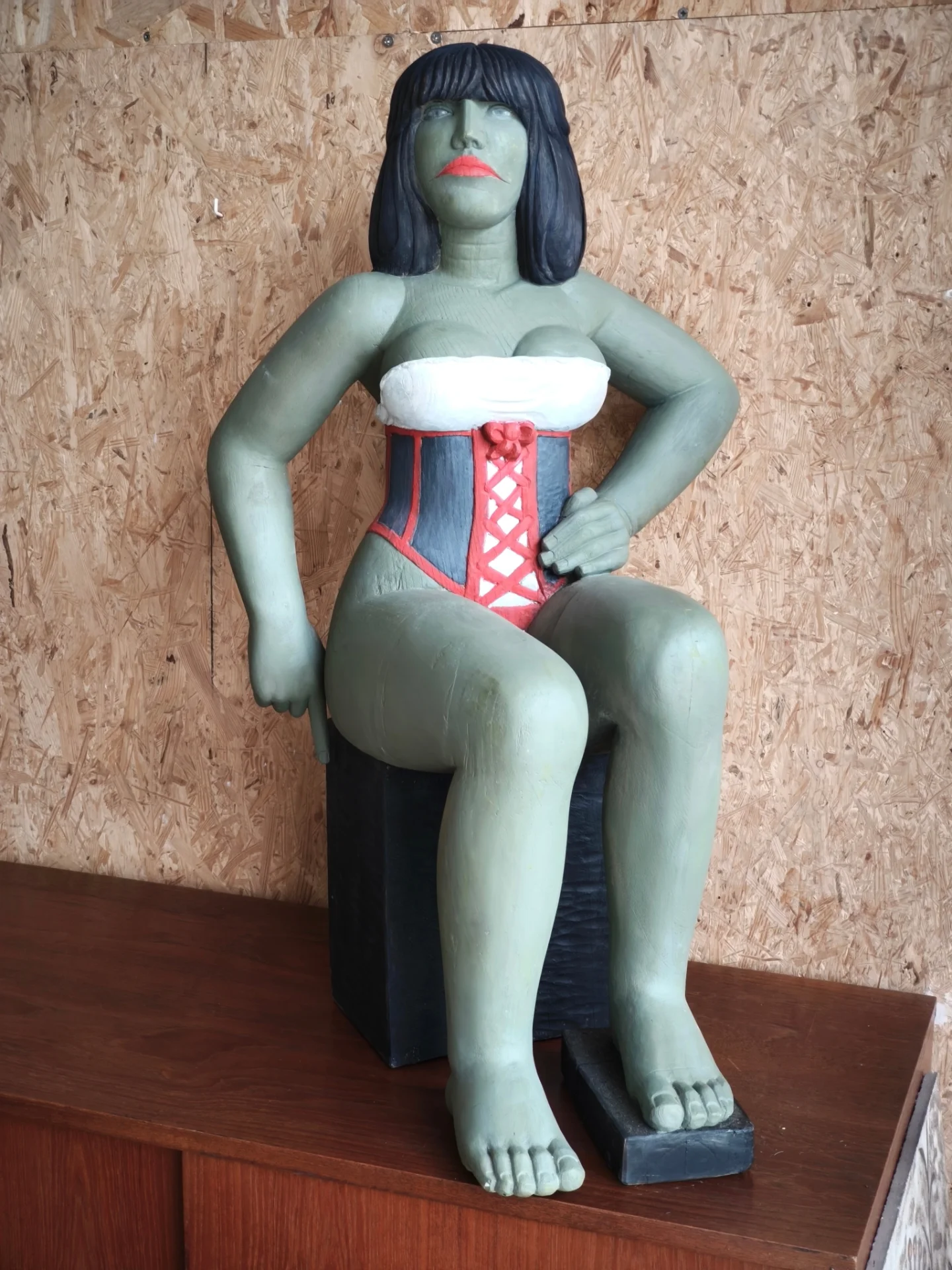 Sculpture expressive en bois polychrome réalisée par l’artiste français Benoît Lasserre. Cette figure féminine, représentée assise avec assurance, se distingue par ses formes généreuses et son style volontairement stylisé. Le traitement sculptural du bois, visible dans les traces de taille, confère à l’œuvre une forte présence et une grande vitalité.