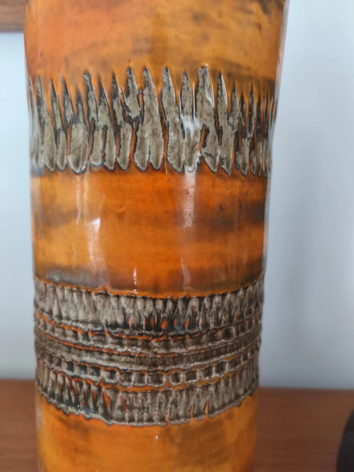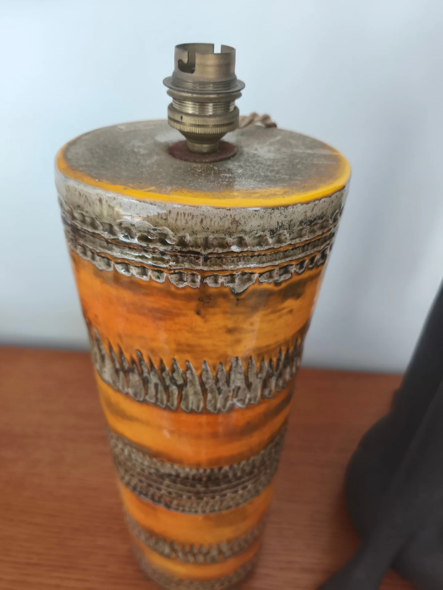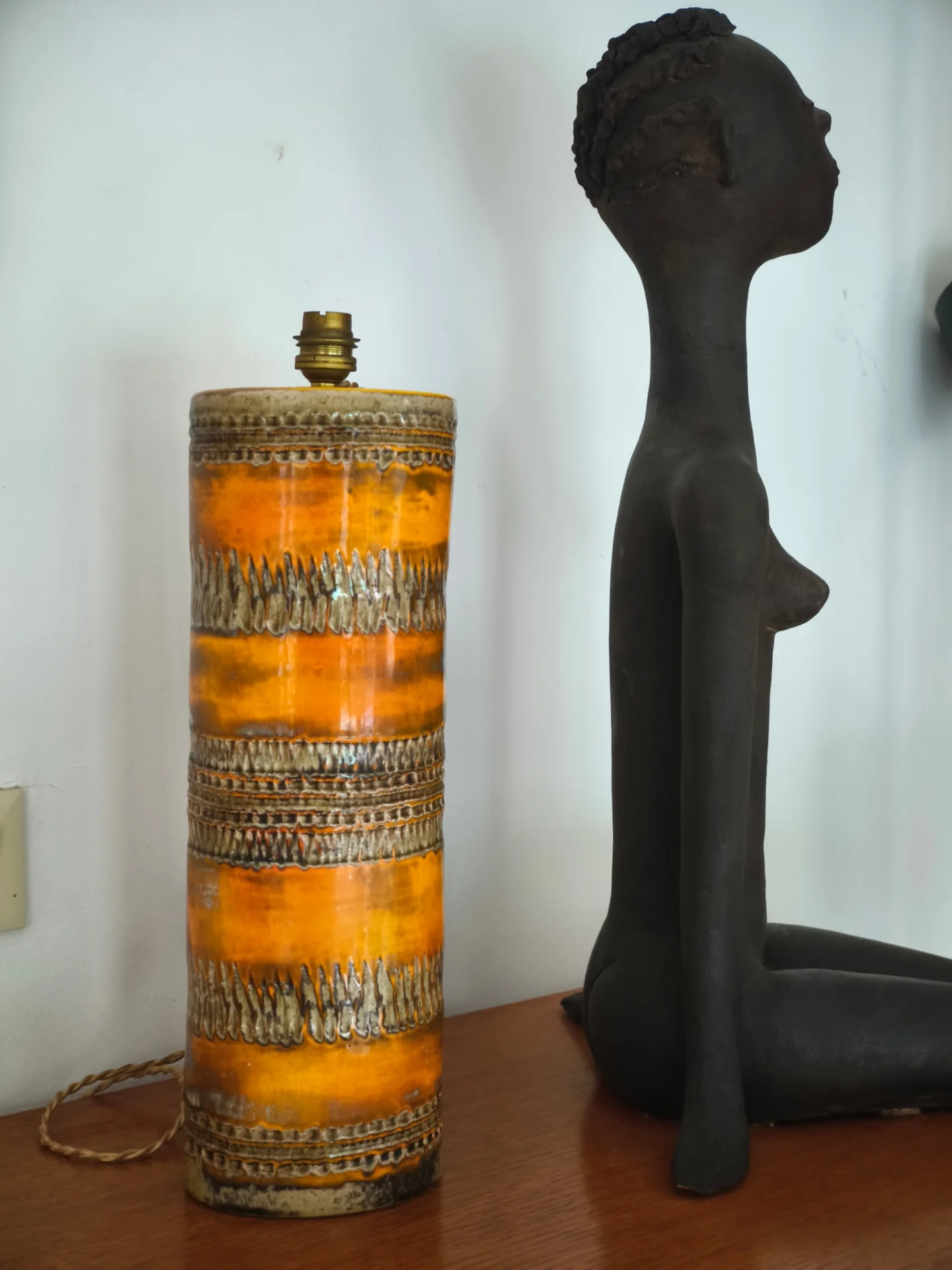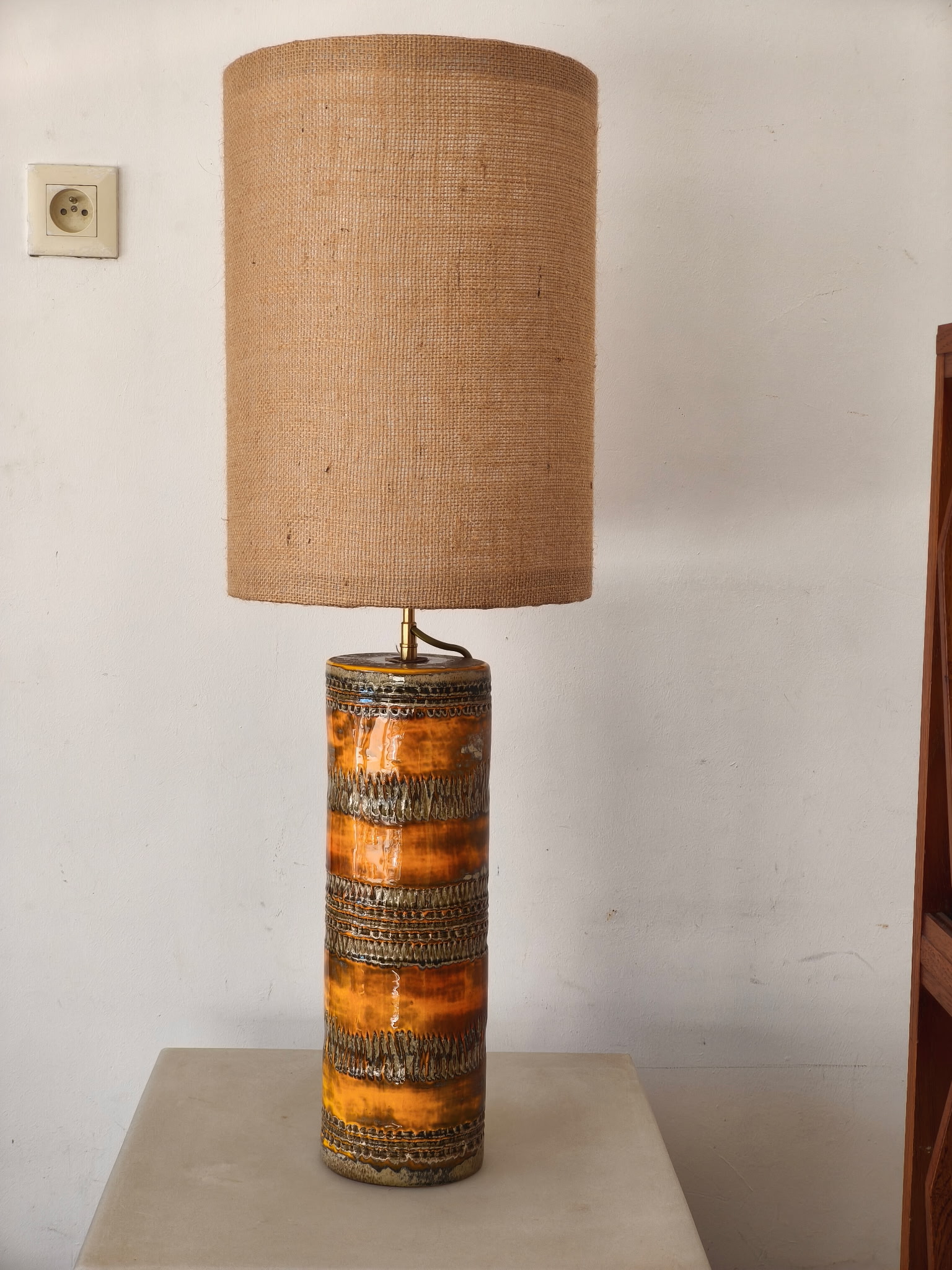 Rare lampe à poser en céramique de la Poterie Périgordine, pied cylindrique décoré de motifs en relief et d’un émaillage brun orangé typique des années 70. Ce luminaire vintage français séduit par son authenticité et son caractère artisanal,