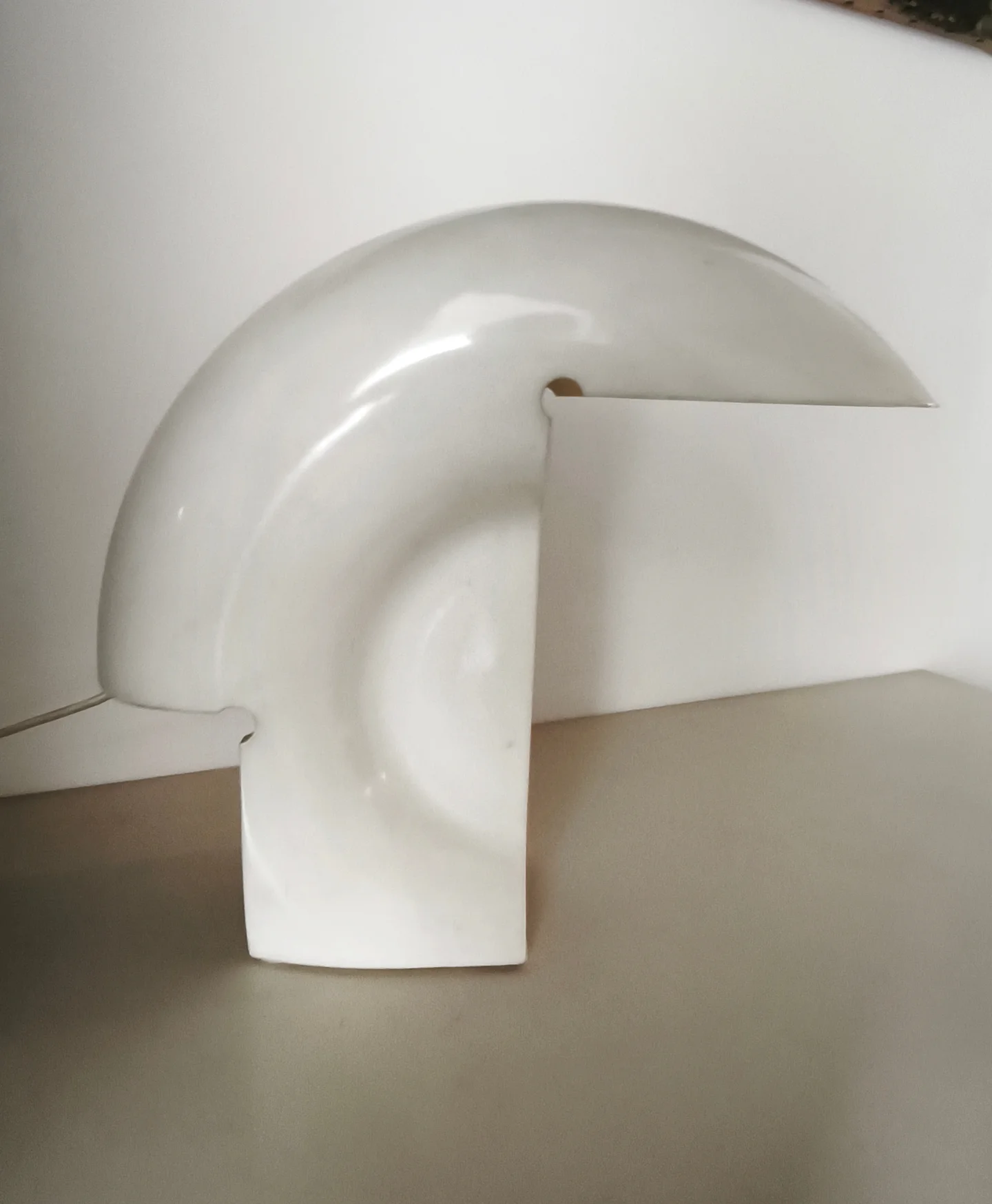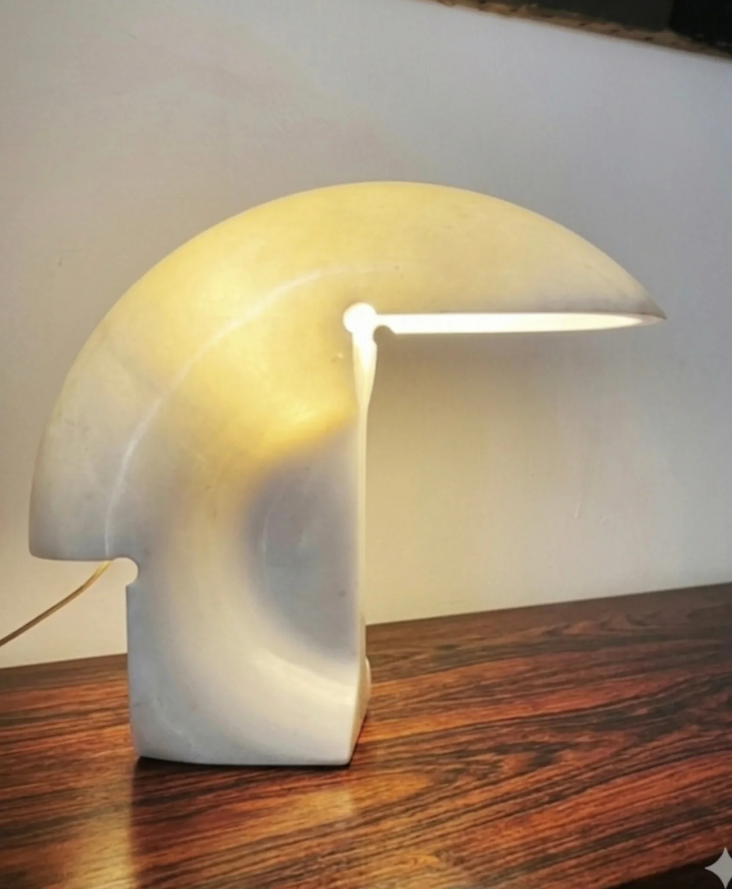 Intemporelle lampe Biagio dessinée par Tobia Scarpa en 1968 pour Flos, véritable icône du design italien. Taillée dans un bloc de marbre blanc massif, cette pièce sculpturale allie élégance minimaliste et prouesse technique. Ses lignes courbes et équilibrées diffusent une lumière douce et chaleureuse, mettant en valeur la noblesse naturelle du marbre.