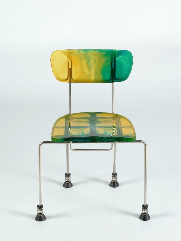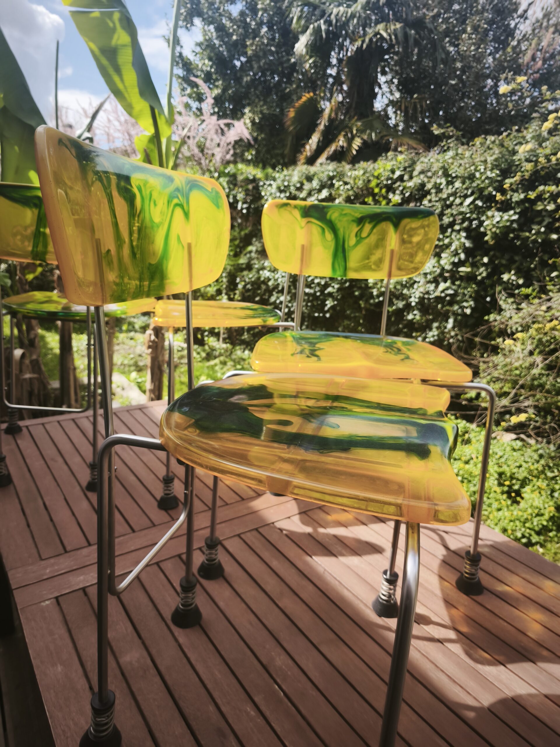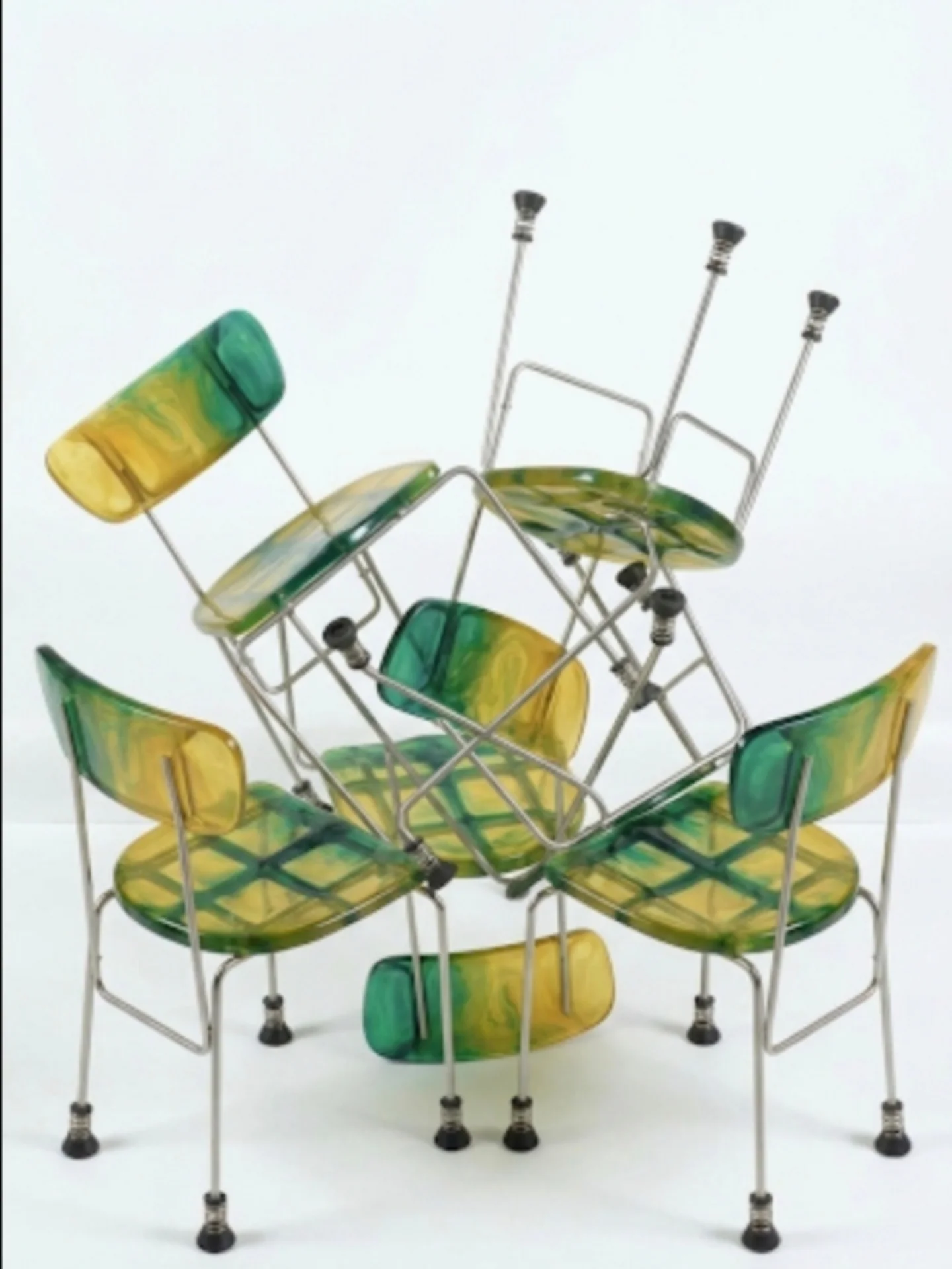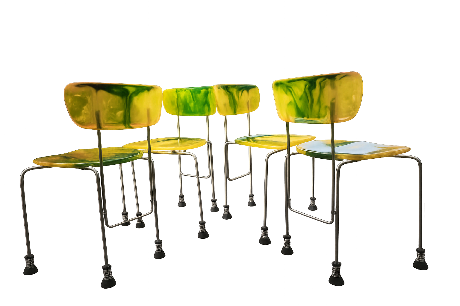 Exceptionnel lot de 4 chaises Broadway dessinées par Gaetano Pesce, figure majeure du design italien contemporain. Réalisées en résine, ces pièces se distinguent par leurs couleurs vibrantes et leurs effets de matière uniques, chaque chaise présentant des nuances et marbrures singulières. L’alliance du métal tubulaire et de l’assise en résine confère à l’ensemble une esthétique à la fois industrielle et artistique. Véritables sculptures fonctionnelles, ces chaises incarnent l’approche expérimentale et expressive de Pesce, idéales pour un intérieur audacieux et collectionneur.
