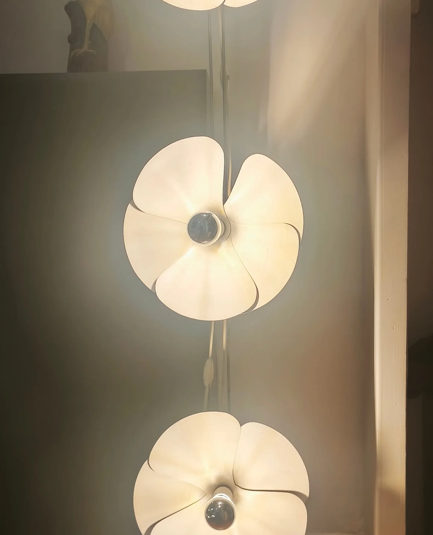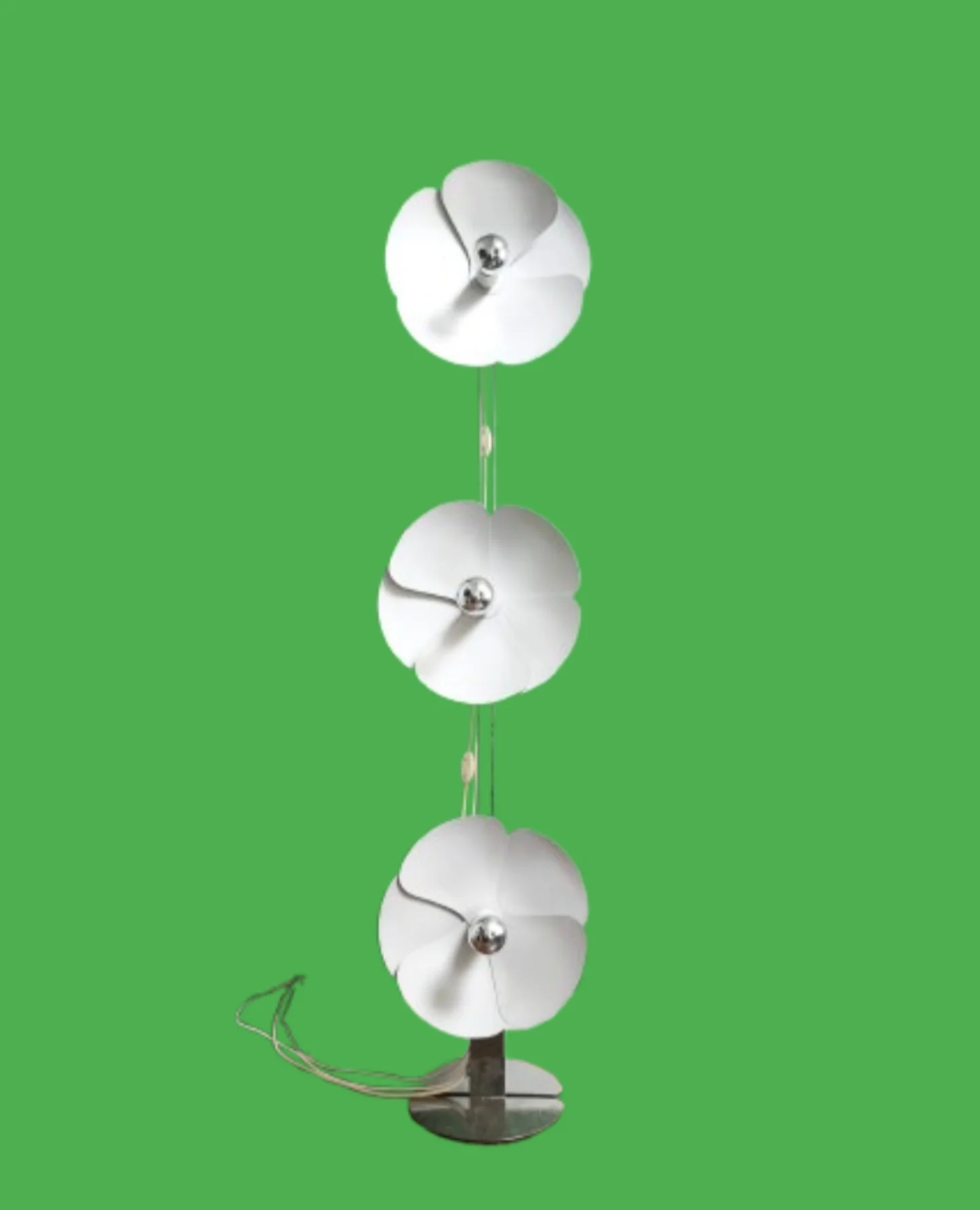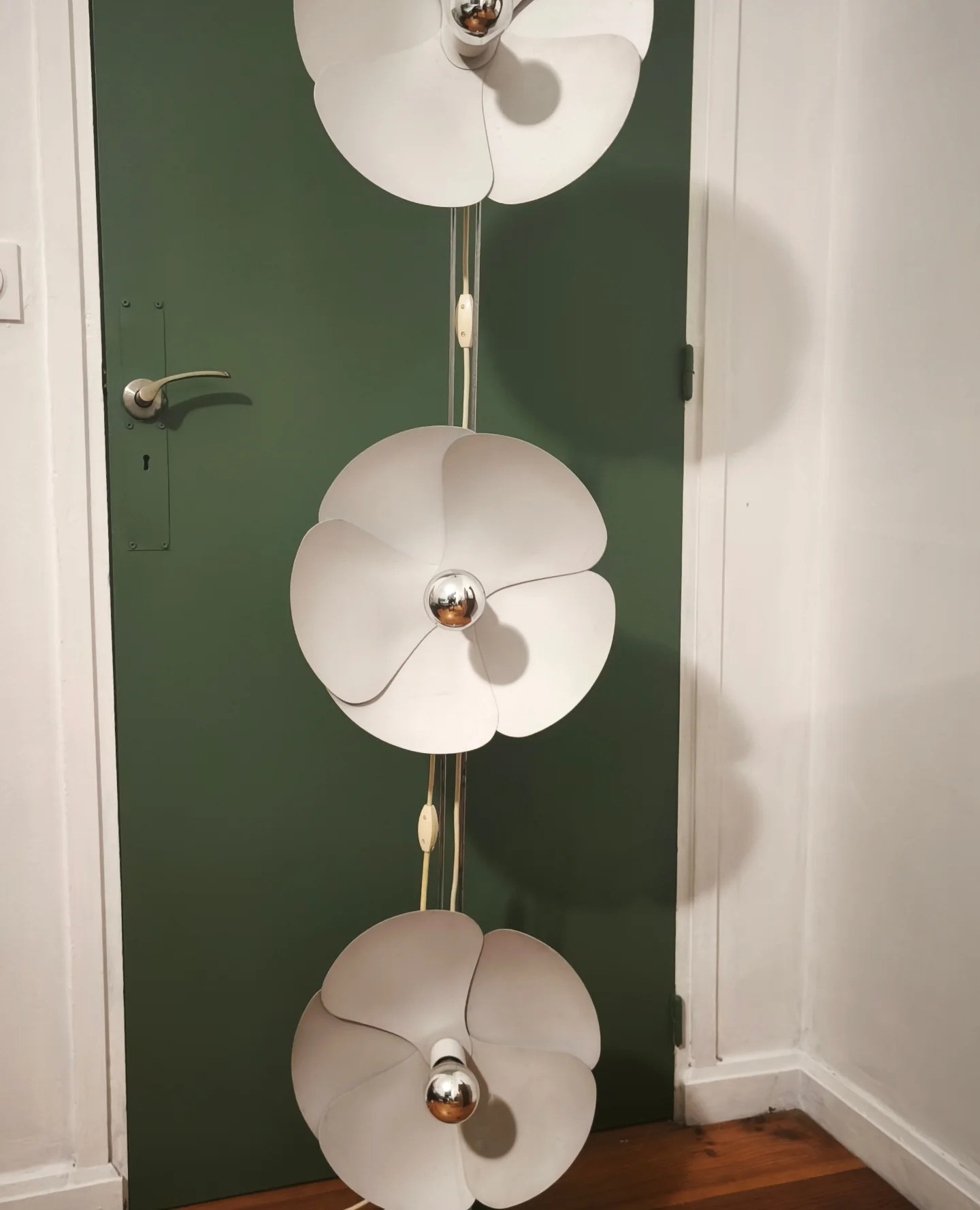 Inimitable lampadaire Fleur dessiné par Olivier Mourgue et édité par Disderot, composé de trois diffuseurs en forme de pétales offrant une présence visuelle douce et spectaculaire. Ce luminaire iconique des années 70 séduit par l’élégance de ses lignes, la pureté de son coloris blanc et son esprit futuriste typique du design français vintage. Une pièce rare et pleine de caractère, aussi belle éteinte qu’illuminée.
