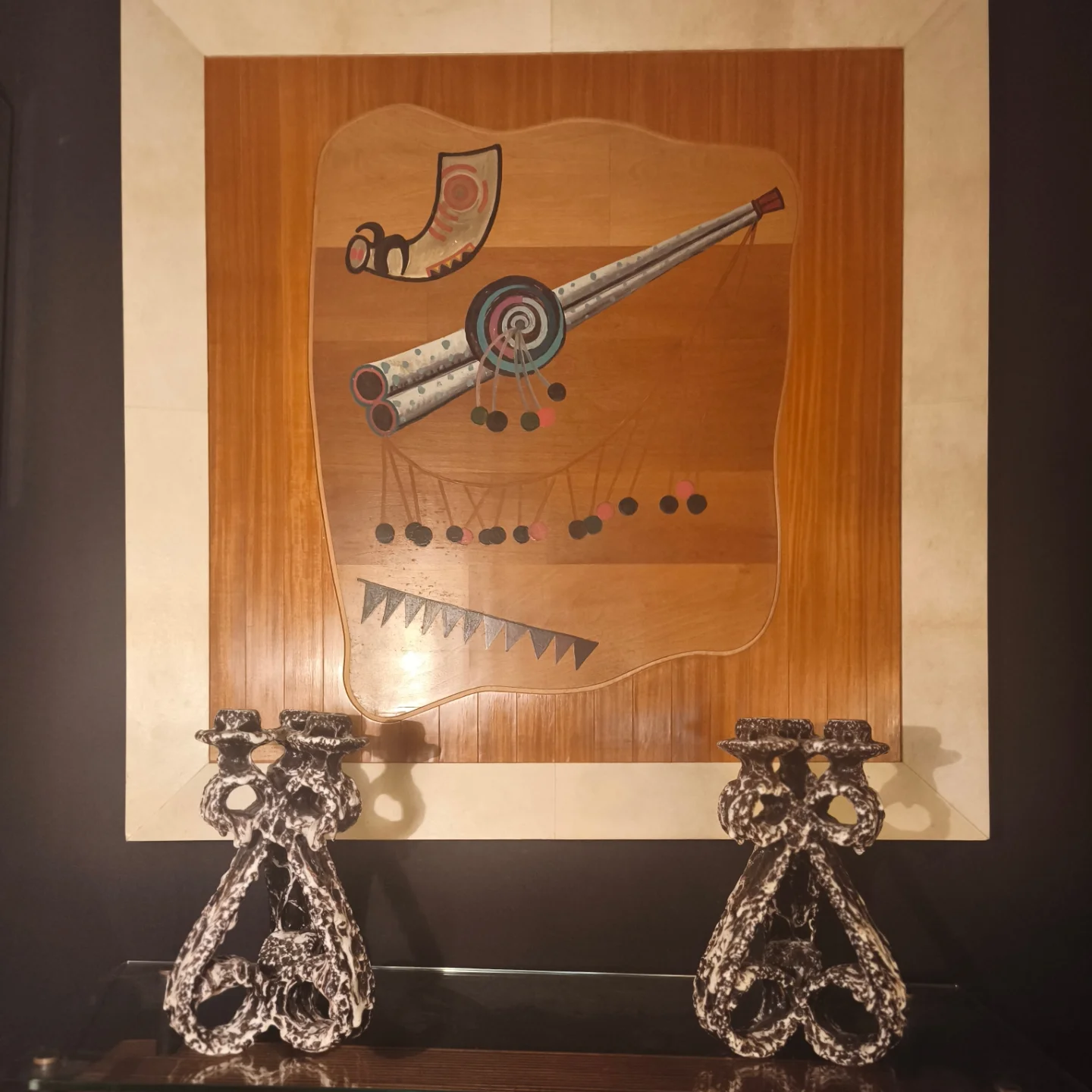 Spectaculaire paire de bougeoirs en céramique signée Marius Giuge, célèbre céramiste de Vallauris. Leur forme sculpturale et organique, presque architecturale, évoque les expérimentations artistiques de la céramique française des années 50–60. L’émail noir et blanc moucheté met en valeur les reliefs et les ouvertures de la structure, donnant à ces pièces une présence forte et expressive. Véritables objets d’art, ces bougeoirs incarnent l’esprit créatif de Vallauris, créant une mise en scène élégante et singulière pour un dîner aux chandelles.