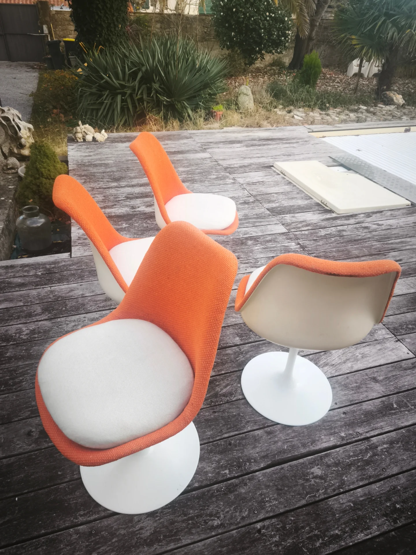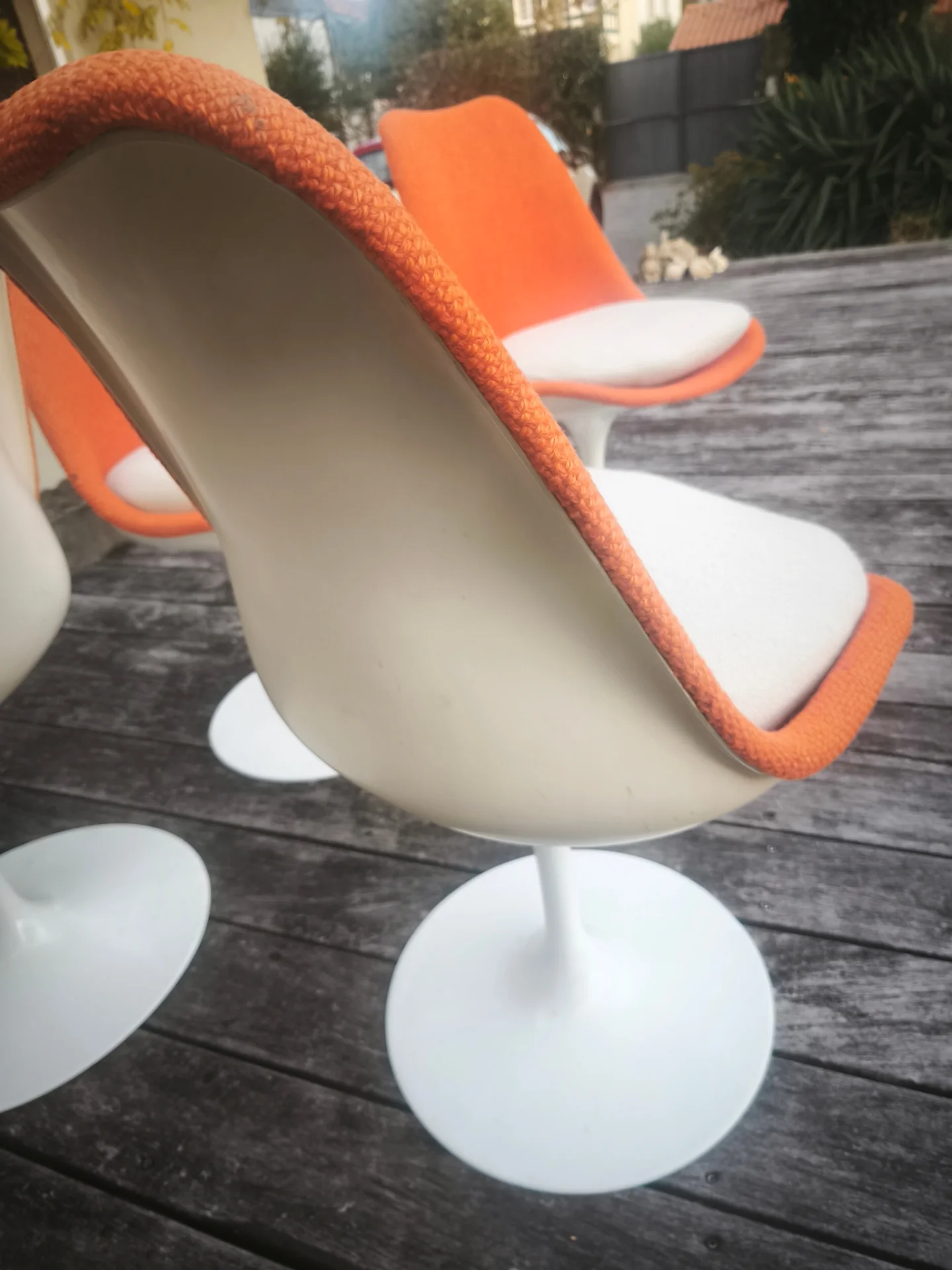 Superbe ensemble de quatre chaises Tulipe dessinées par Eero Saarinen en 1956 et éditées par Knoll, véritables icônes du design moderniste. Leur célèbre piètement central en aluminium laqué blanc, signature de la collection, apporte une grande légèreté visuelle tout en supprimant l’enchevêtrement des pieds traditionnels. Les coques enveloppantes sont habillées d’un tissu Kvadrat d’origine, orange qui contraste harmonieusement avec l’assise claire, offrant à la fois confort et caractère.